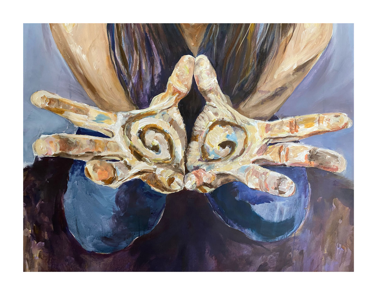 Sostenida por la tierra pero con las manos elevadas al cielo, con espirales de barro dibujados en las palmas y los ojos cerrados, busco honrar nuestro origen y nuestro final: la tierra.